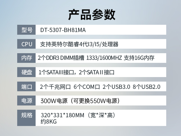 東田工控DT-5307-BH81MA是一款壁掛式工控機(jī),采用酷睿4代13/15/17處理器,內(nèi)存2個(gè)DDR3,支持16G。300W額定電源。單面出線,支持7個(gè)擴(kuò)展槽,2個(gè)千兆網(wǎng)口,6個(gè)COM口,支持多種操作系統(tǒng),歡迎定制。
